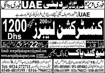 Vacant posts including labor and construction labor are announced in New Gulf Pak Recruiting Agency Dubai, abu dhabi Dubai as per 17 December 2025 advertisement in daily Express Newspaper. Candidates with Intermediate and Matric etc. educational background will be preferred.
