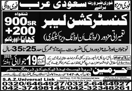 Harmain Trade Test & Technical Training Center jobs advertisement dated about 17 July 2025 in daily Express Newspaper invites application for the vacant post of construction labor in Dammam, taif Saudi Arabia. Matric, Intermediate and Middle etc. educational qualification will be preferred.