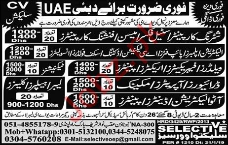 Experienced and technical personnel for the positions of Shuttering Carpenter, Steel Fixer, Finishing Carpenter, Electrician, Plumber, Pipe Fitter, AC Technician, Scaffolder, Welder, Fabricator, Painter, Technician, Labor, Helper, Cleaner, Auto Electrician, Dentor, Painter required for a leading oversea company in Dubai UAE 2019.