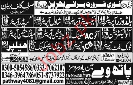 A well known and reputed construction company required experienced and strong personnel for the posts of Bulldozer Operator, Exporter Operator, Shovel Operator, Grader Operator, Auto Electrician, Auto AC Mechanic, Lathe Machine Operator, Fork Lift Operator, JCB Operator, Mechanic, Helper in Bahrain.