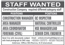 Vacant posts including qc inspector, hse manager, area manager, material controller, civil engineer, hse lead, foreman civil, construction manager, foreman and area coordinator are announced in Construction Company Islamabad, islamabad Islamabad Pakistan as per 28 March 2024 advertisement in daily Khabrain Newspaper. Educational qualifications required B.E, Matric, DAE, Bachelor and Intermediate etc.