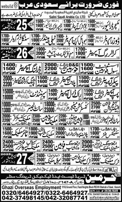 Ghazi Overseas Employment invites applications for job positions advertised in daily Express dated 25 April 2025 for following vacancies in Dammam, riyadh Saudi Arabia.