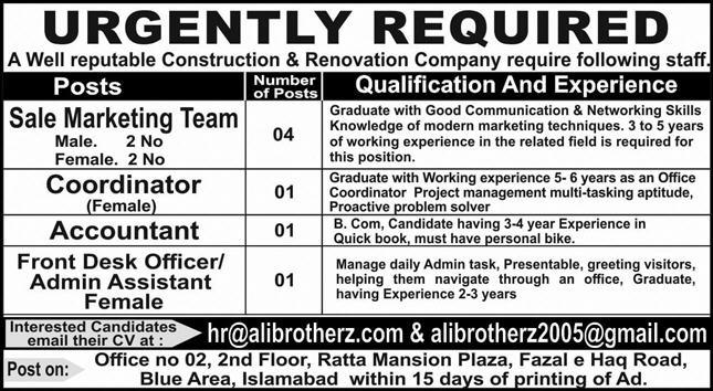 Construction & Renovation Company jobs advertisement dated about 28 July 2024 in daily Express Newspaper invites application for the vacant post of admin assistant, accountant, front desk officer, sales marketing team and coordinator in Islamabad, islamabad Islamabad Pakistan. Educational qualifications required Bachelor and Master etc.
