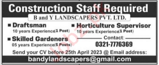 Vacant posts including horticulture supervisor, draftsman and skilled gardeneres are announced in Construction Company Rawalpindi, rawalpindi Punjab Pakistan as per 16 April 2023 advertisement in daily Jang Newspaper. Persons with Intermediate, Middle, DAE and Matric etc. education can apply.