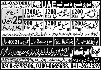 Vacant posts including helper, shuttering carpenter, block mason, steel fixer, painter and plaster mason are announced in Arshman Manpower Bureau UAE, uae UAE as per 20 January 2023 advertisement in daily Express Newspaper. Persons with Matric, Primary, Middle, Intermediate, DAE and Bachelor etc. education can apply.