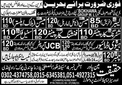 A well reputed and established Bahrain based company invites applications from highly educated expert and experienced professionals for the post of Labor, Mason, Tile Mason, Marble Mason, Block Mason, Plaster Mason, Shuttering Carpenter, Finishing Carpenter, Steel Fixer, Heavy Driver, JCB Operator, Plumber in Bahrain.