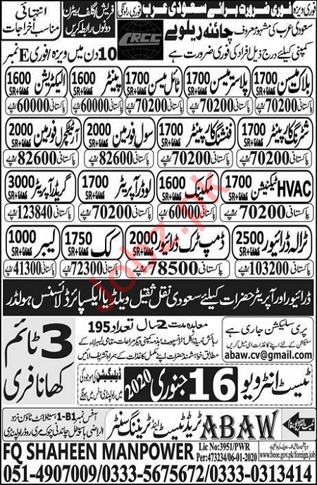 A well reputed and well established company is looking for Block Mason, Plaster Mason, Tile Mason, Painter, Electrician, Shuttering Carpenter, Finishing Carpenter, Civil Foreman, Architectural Foreman, HVAC Technician, Mechanic, Loader Operator, Grader Operator, Trala Driver, Demp Trcuk Driver, HTV Druiver, LTV Driver, Cook, Labor in Saudi Arabia.