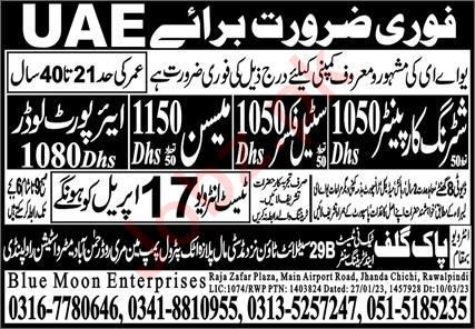 Blue Moon Enterprises jobs advertisement dated about 16 April 2023 in daily Express Newspaper invites application for the vacant post of mason, airport loader, steel fixer and shuttering carpenter in UAE, uae UAE. Intermediate, Matric, DAE and Middle etc. educational qualification will be preferred.