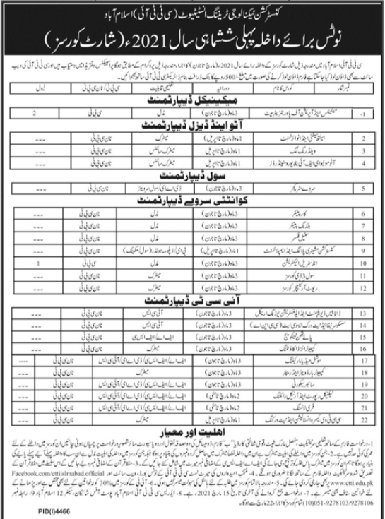 Construction Technology Training Institute CTTI Islamabad has announced admissions for short courses in Mechanical Department, Auto & Diesel Department, Civil Department, Quantity Survey Department and ICT Department. Read newspaper ad for exact details.