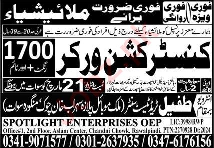Spotlight Enterprises latest Overseas Labor jobs and others can be applied till 21 March 2024 or as per closing date in newspaper ad. Read complete ad online to know how to apply on latest Spotlight Enterprises job opportunities. Free accommodation, medical and transport may be available.