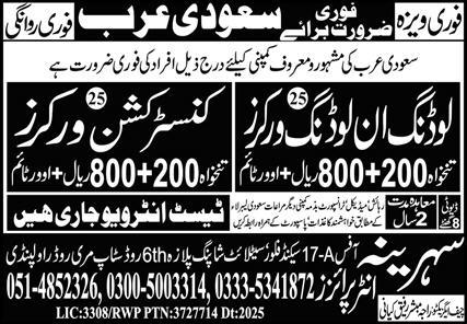 Sehreena Trade Test and Training Center invites applications for job positions advertised in daily Express dated 21 June 2025 for following vacancies in Jeddah, dammam Saudi Arabia.
