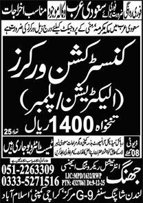 Jhang International Recruiting Agency Makkah, madina Saudi Arabia invites applications from eligible candidates for the post of construction worker, electrician and plumber as per advertisement of December 10, 2025 published in daily Express Newspaper. Preferred Education is Matric and Intermediate etc.