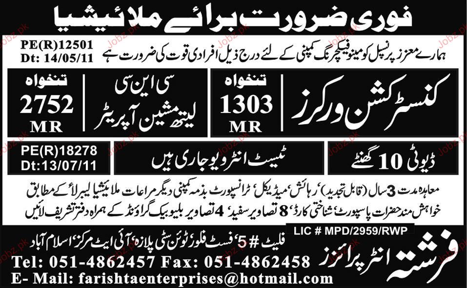 Construction Workers and Lathe Machine Operator are Required in Malysia