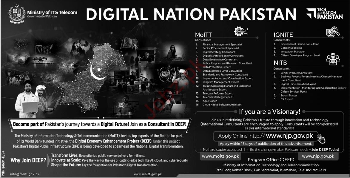 Vacant posts including consultant are announced in Ministry of Information Technology & Telecommunication MOIT Islamabad, islamabad Islamabad Pakistan as per 12 January 2025 advertisement in daily Nawaiwaqt Newspaper. Preferred Education is Bachelor and Master etc.