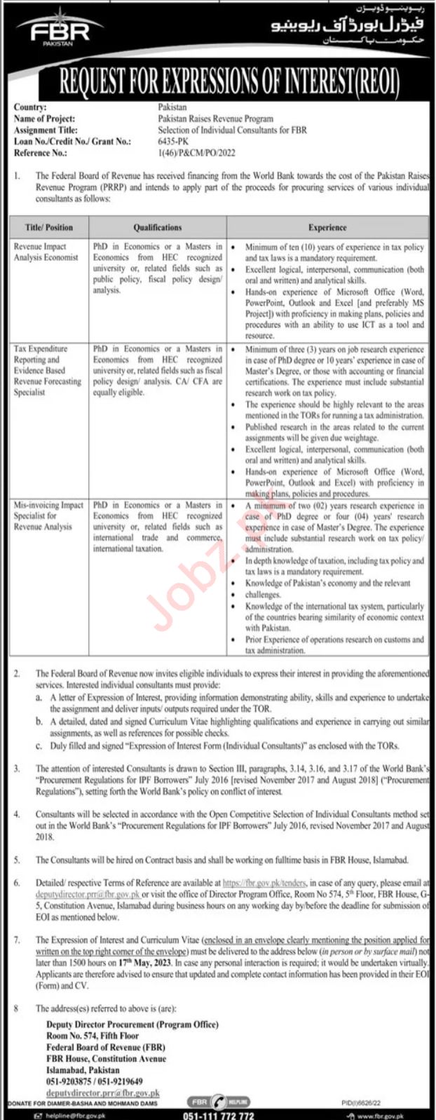Vacant posts including tax expenditure reporting specialist, revenue impact analysis economist and mis invoicing impact specialist are announced in Federal Board of Revenue FBR Islamabad, islamabad Islamabad Pakistan as per 30 April 2023 advertisement in daily Jang Newspaper. Candidates with Master and Phd etc. educational background will be preferred.