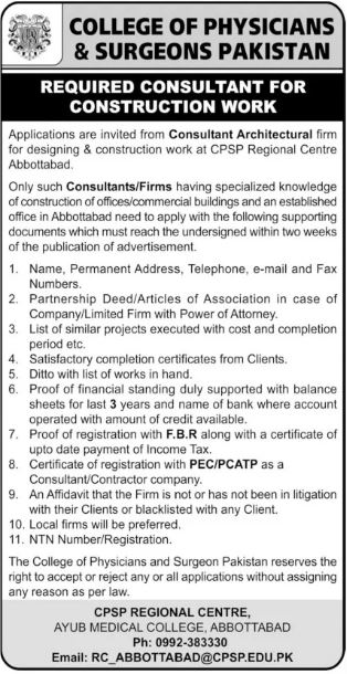 College of Physician and Surgeons Pakistan CPSP invites applications for job positions advertised in daily The News dated 6 July 2022 for following vacancies in Abbottabad, abbottabad Khyber Pakhtunkhwa KPK Pakistan.