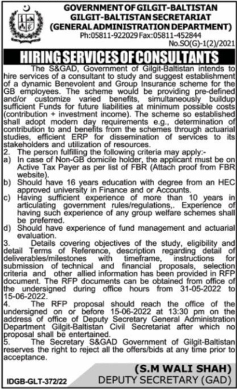 Apply at Gilgit Baltistan Secretariat latest Government jobs in Consultant and departments before closing date which is around June 15, 2022 or as per closing date in newspaper ad. Read complete ad online to know how to apply on latest Gilgit Baltistan Secretariat job opportunities.