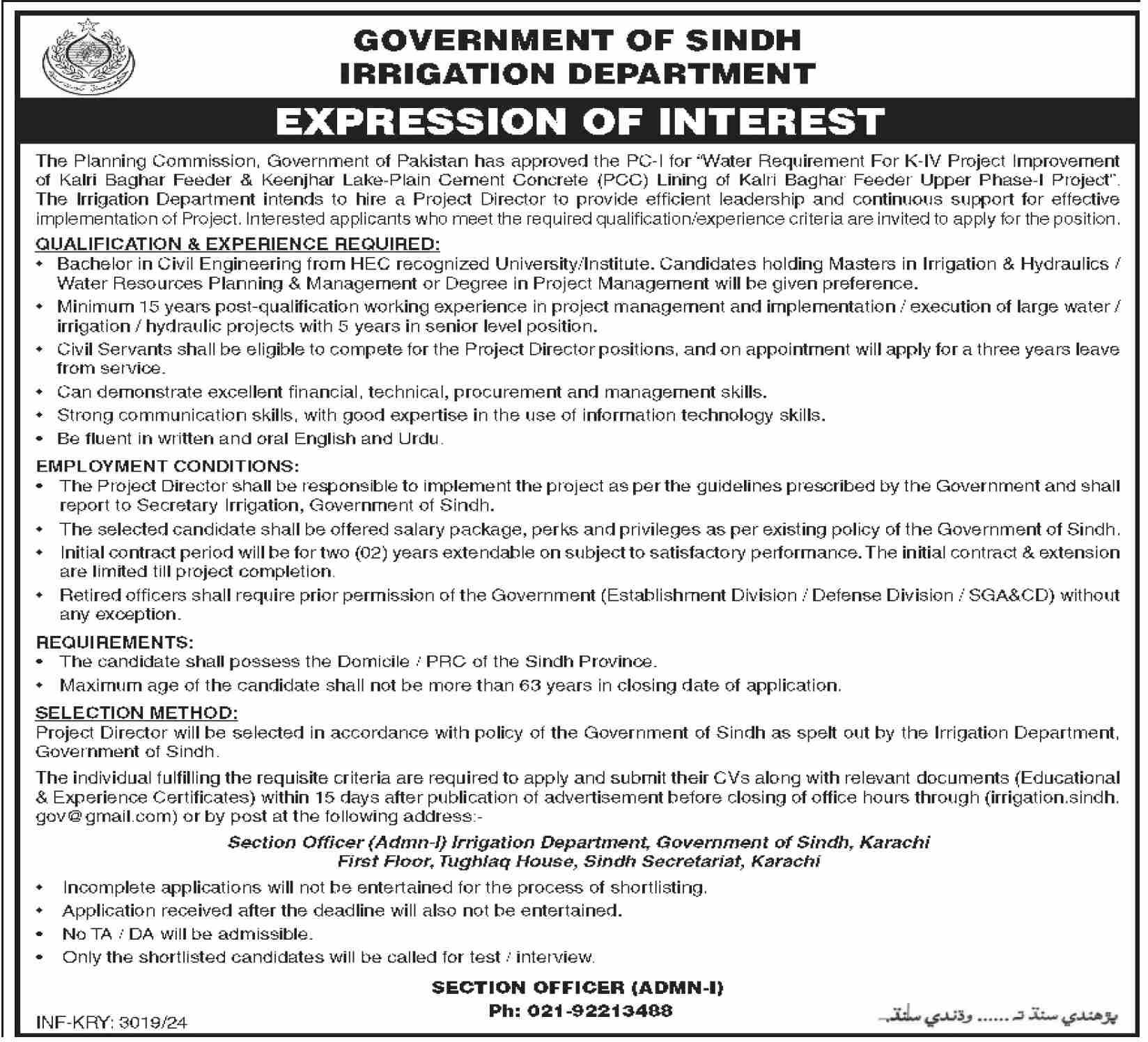 Vacant posts including project director are announced in Irrigation Department Karachi, karachi Sindh Pakistan as per 24 September 2024 advertisement in daily Dawn Newspaper. B.E and Bachelor etc. educational qualification will be preferred.