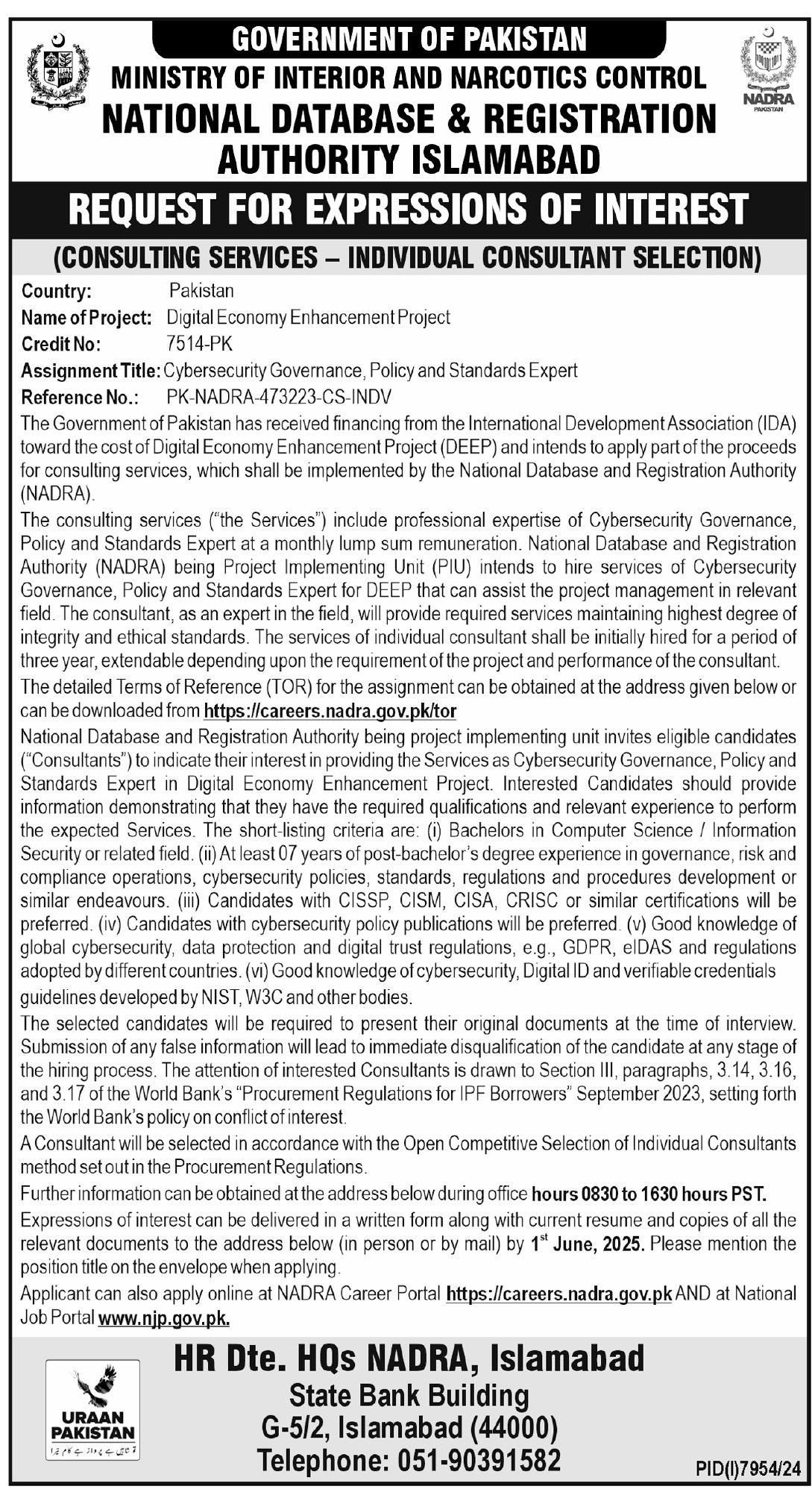 National Database & Registration Authority NADRA G-5 Islamabad, islamabad Islamabad Pakistan invites applications from eligible candidates for the post of cybersecurity governance as per advertisement of May 18, 2025 published in daily Express Tribune Newspaper. Persons with Bachelor and Master etc. education can apply.
