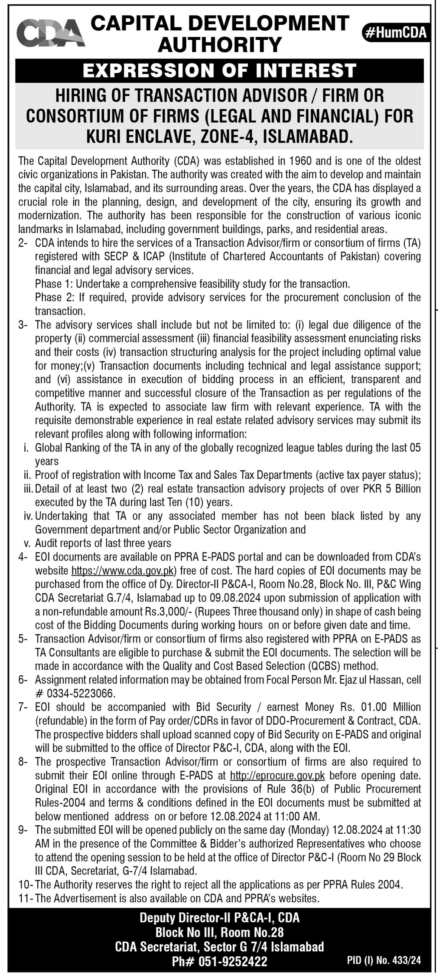 Capital Development Authority CDA Islamabad, islamabad Islamabad Pakistan invites applications from eligible candidates for the post of transaction advisor as per advertisement of July 20, 2024 published in daily Express Tribune Newspaper. Candidates with Bachelor and Master etc. educational background will be preferred.