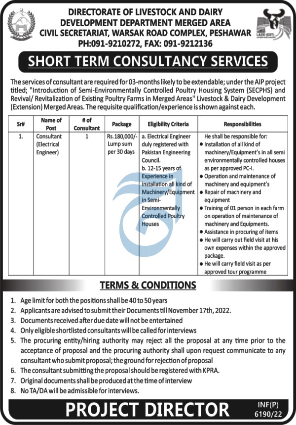 Livestock and Dairy Development Department Peshawar, peshawar Khyber Pakhtunkhwa KPK Pakistan invites applications from eligible candidates for the post of consultant electrical engineer as per advertisement of October 27, 2022 published in daily Aaj Newspaper. B.E and Bachelor etc. educational qualification will be preferred.