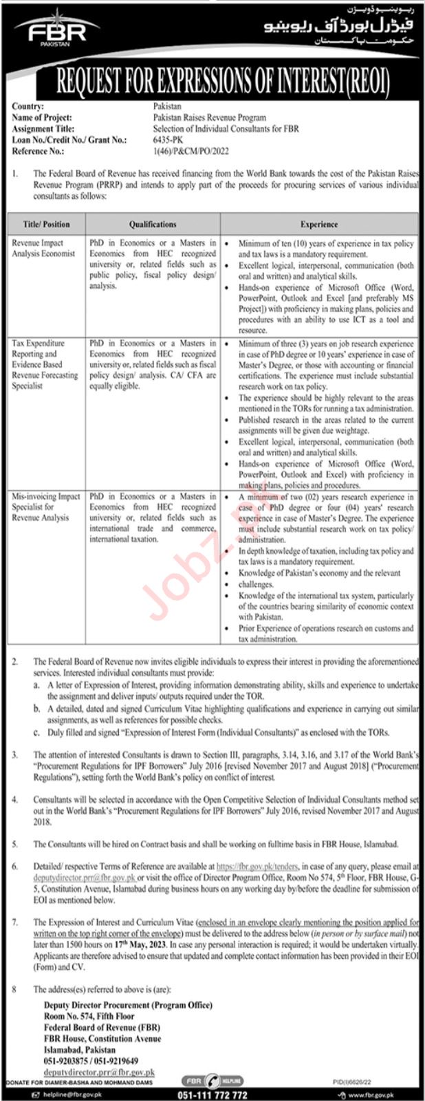 Apply at Federal Board of Revenue FBR latest Government jobs in Consultant and departments before closing date which is around May 17, 2023 or as per closing date in newspaper ad. Read complete ad online to know how to apply on latest Federal Board of Revenue FBR job opportunities.