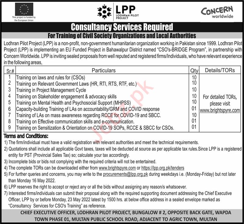 Latest Private jobs in Lodhran Pilot Project LPP in Consultant and others can be applied till 16 May 2022 or as per closing date in newspaper ad. Read complete ad online to know how to apply on latest Lodhran Pilot Project LPP job opportunities.
