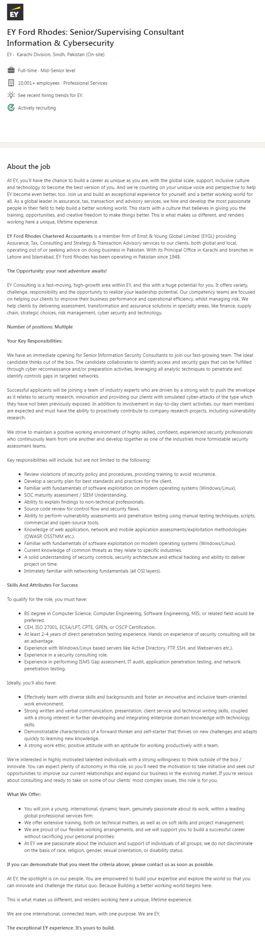 EY Ford Rhodes jobs advertisement dated about 15 February 2023 in daily Other Newspaper invites application for the vacant post of supervising consultant information cybersecurity in Karachi, karachi Sindh Pakistan. Persons with Master and Bachelor etc. education can apply.