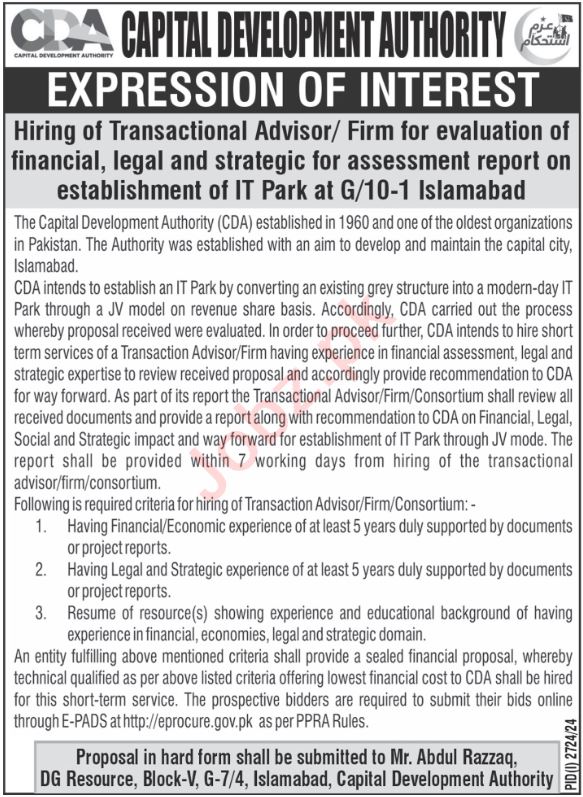 Vacancies in Capital Development Authority CDA Advertisement October 2024