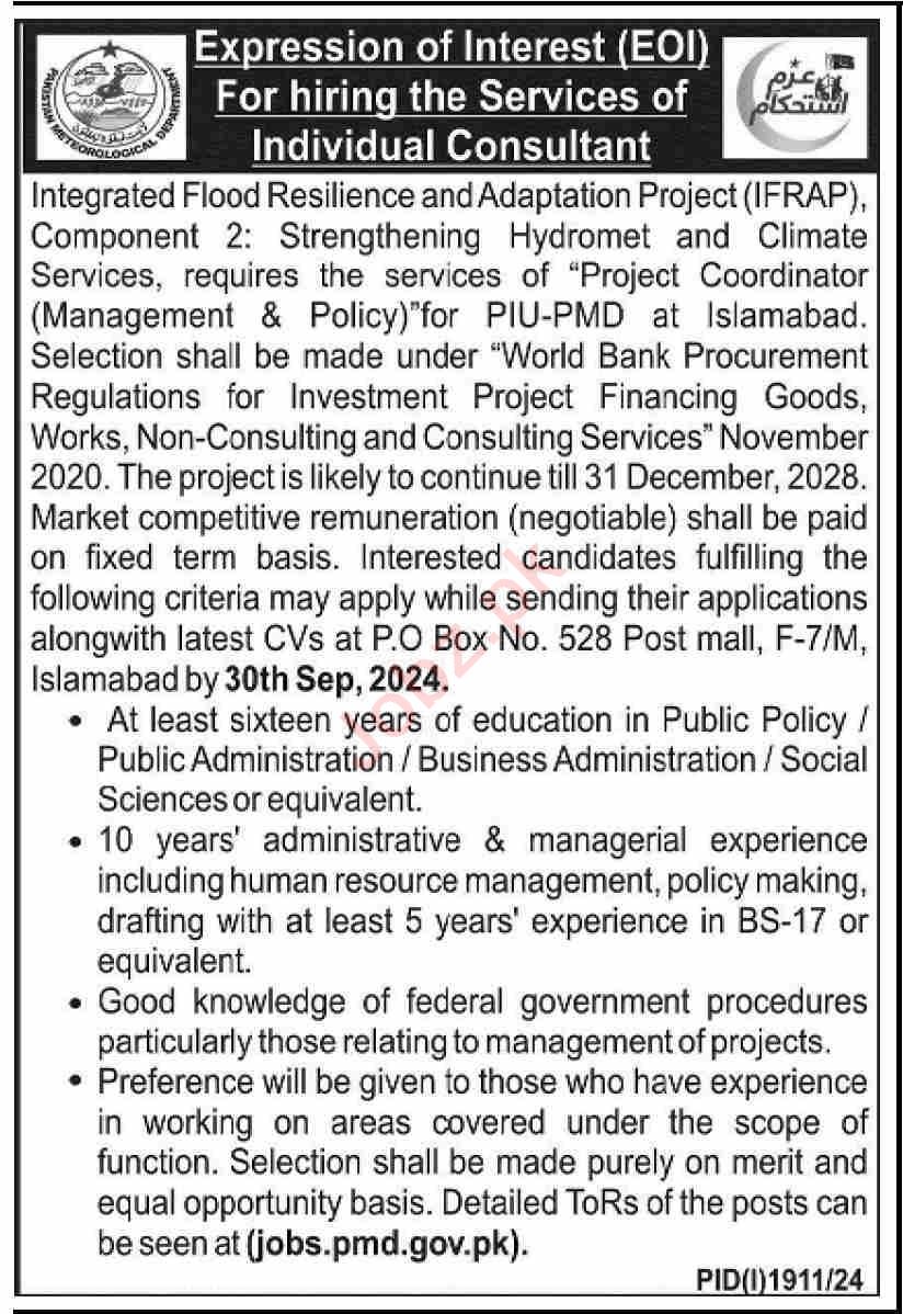 Vacant posts including project coordinator are announced in Pakistan Meteorological Department PMD Karachi, karachi Sindh Pakistan as per 15 September 2024 advertisement in daily Dawn Newspaper. Preferred Education is Bachelor and Master etc.