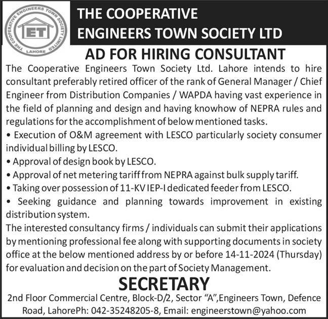 Latest The Cooperative Engineers Town Society Consultant Posts Lahore 2025