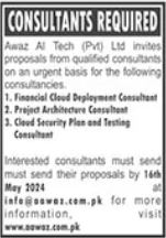Aawaz Ai Tech jobs advertisement dated about 14 May 2024 in daily The News Newspaper invites application for the vacant post of project architecture consultant, financial cloud deployment consultant and cloud security plan testing consultant in Islamabad, islamabad Islamabad Pakistan. Preferred Education is Master and Bachelor etc.