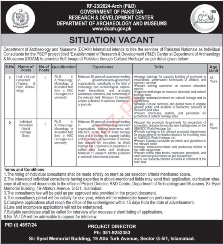 Department of Archaeology & Museums Islamabad, islamabad Islamabad Pakistan invites applications from eligible candidates for the post of individual consultant as per advertisement of January 20, 2025 published in daily Ausaf Newspaper. Candidates with Phd etc. educational background will be preferred.