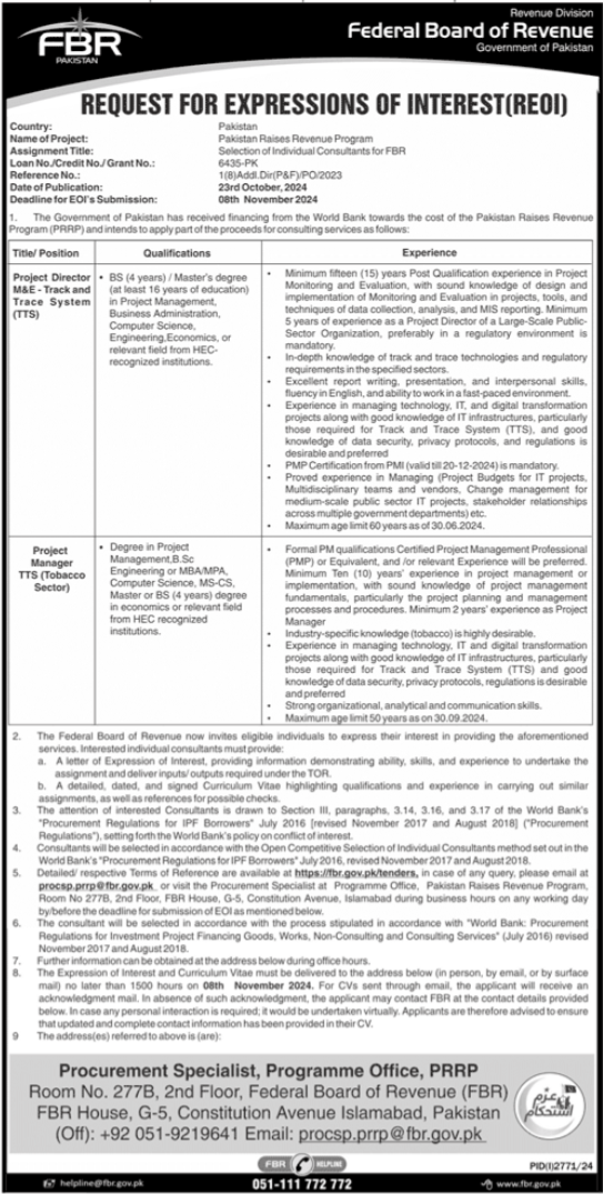 Federal Board of Revenue FBR invites applications for job positions advertised in daily Jang dated 23 October 2024 for following vacancies in Islamabad, islamabad Islamabad Pakistan.
