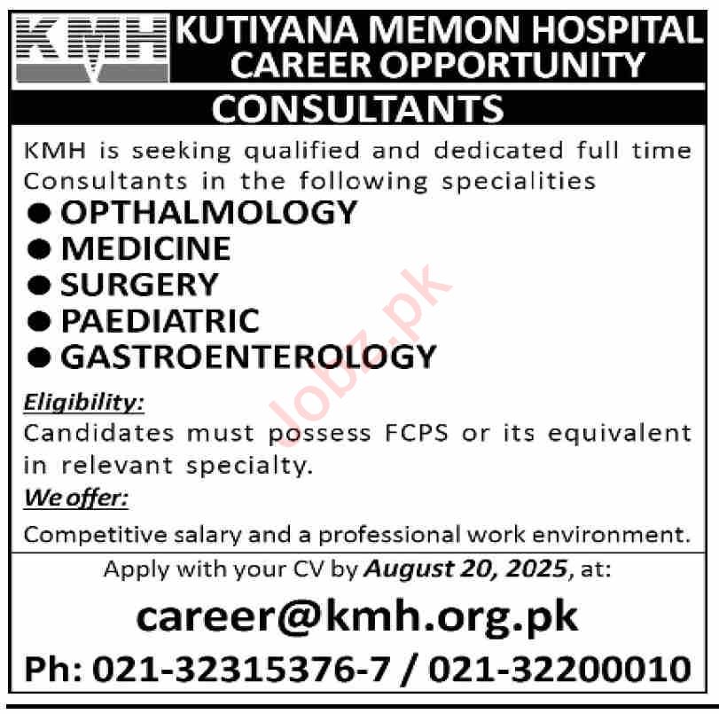 Kutiyana Memon Hospital is looking for candidates for following posts as per job advertisement published in daily Dawn Newspaper of August 3, 2025 for location Karachi, karachi Sindh Pakistan: