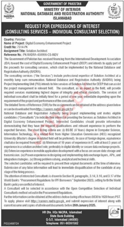 National Database & Registration Authority NADRA latest Government Consultant jobs and others can be applied till 26 January 2025 or as per closing date in newspaper ad. Read complete ad online to know how to apply on latest National Database & Registration Authority NADRA job opportunities.