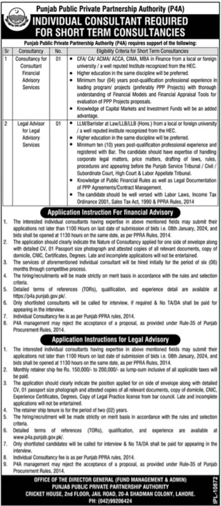 Vacant posts including legal advisor and consultant financial advisory services are announced in Punjab Public Private Partnership Authority Lahore, lahore Punjab Pakistan as per 20 December 2023 advertisement in daily Dunya Newspaper. Candidates with LLM, ACCA, Master, LLb, CA and MBA etc. educational background will be preferred.