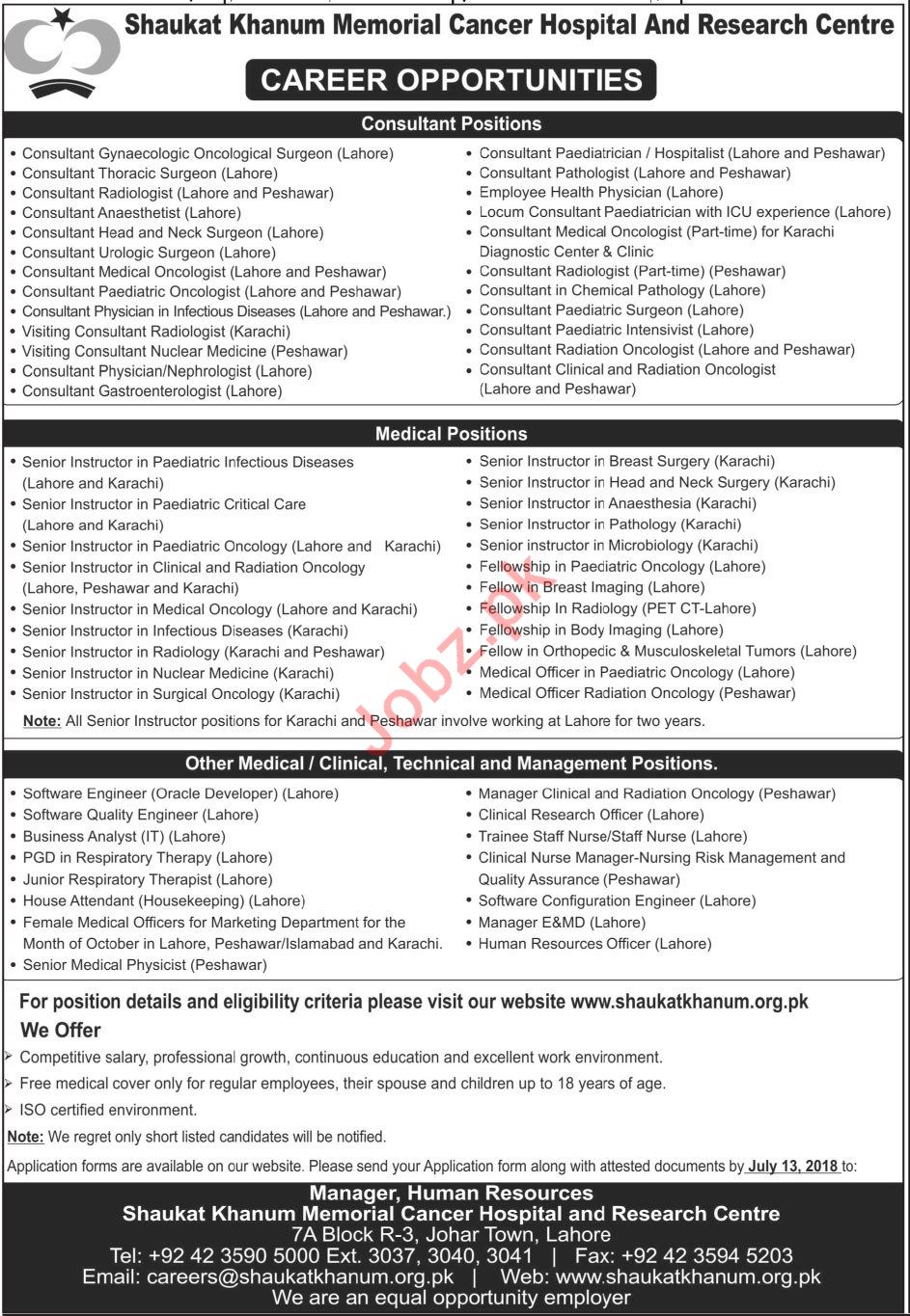 Medical, health, mbbs, doctors and technical personnel for the positions of Consultants, Sr Instructors, Medical Officers, Software Engineer, Analyst, House Attendant, Manager required for Shaukat Khanum Memorial Cancer Hospital & Research Centre in Lahore, Peshawar, Karachi.