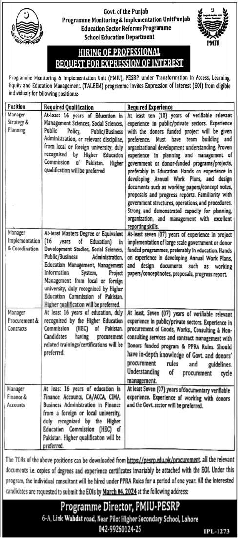 School Education Department Lahore, lahore Punjab Pakistan invites applications from eligible candidates for the post of manager implementation coordination, manager procurement contracts, manager finance accounts and manager strategy planning as per advertisement of February 16, 2024 published in daily Express Tribune Newspaper. Educational qualifications required Bachelor, Master, CA and ACCA etc.