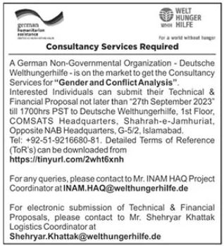 Deutsche Welt hunger hilfe DWHH Islamabad, islamabad Islamabad Pakistan invites applications from eligible candidates for the post of gender conflict analysis consultant and consultant as per advertisement of September 20, 2023 published in daily The News Newspaper. Preferred Education is Bachelor and Master etc.