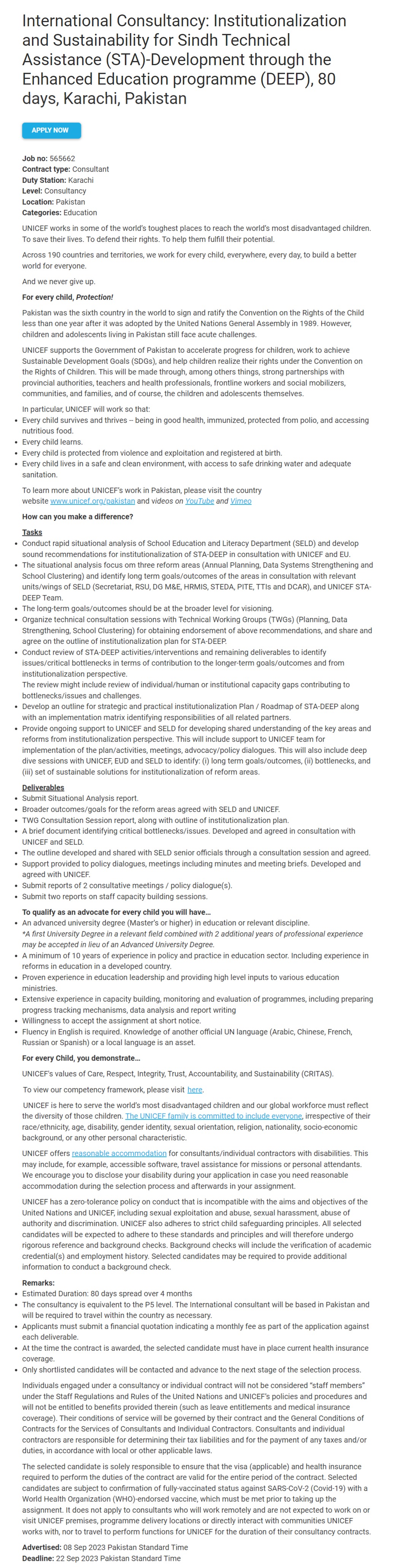 Unicef NGO jobs advertisement dated about 13 September 2023 in daily Other Newspaper invites application for the vacant post of education consultant in Karachi, karachi Sindh Pakistan. Educational qualifications required Master and Bachelor etc.