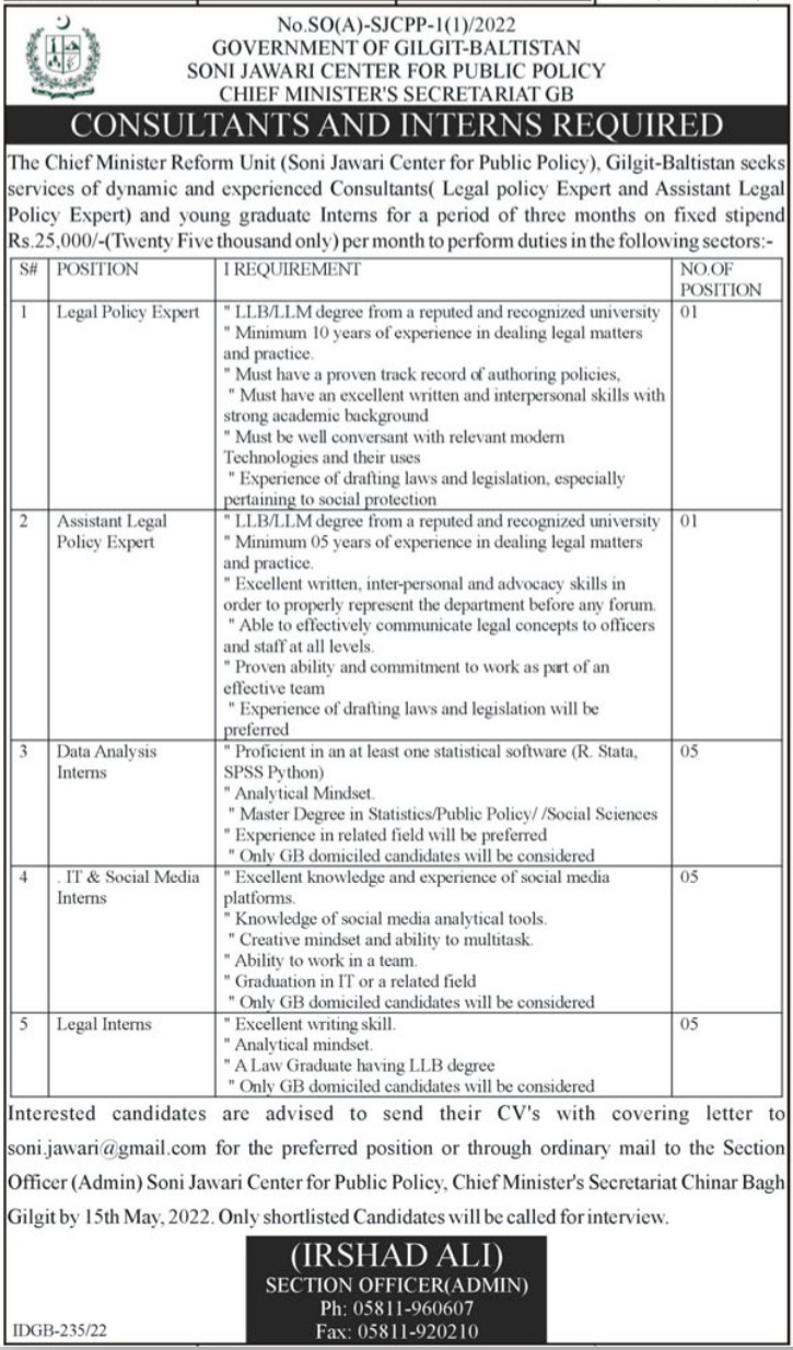 Vacant posts including assistant legal policy expert, legal policy expert, data analysis intern, legal intern and it social media intern are announced in Soni Jawari Center for Public Policy Gilgit, gilgit Gilgit Baltistan Pakistan as per 29 April 2022 advertisement in daily K2 Newspaper. Persons with BCS, LLM, BIT and LLb etc. education can apply.