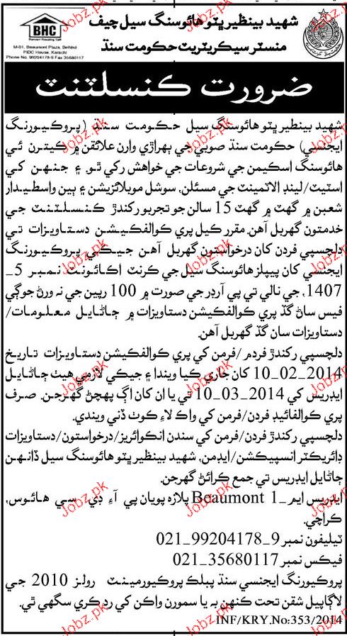 Consultants Job In Shaheed Benazir Bhutto Housing Cell Chief