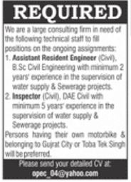 Private Company Gujrat, and Toba Tek Singh Punjab Pakistan invites applications from eligible candidates for the post of Inspector, Assistant Resident Engineer Civil and Assistant Resident Engineer as per advertisement of February 2, 2022 published in daily Jang Newspaper. DAE, Others and Bachelor etc. educational qualification will be preferred.