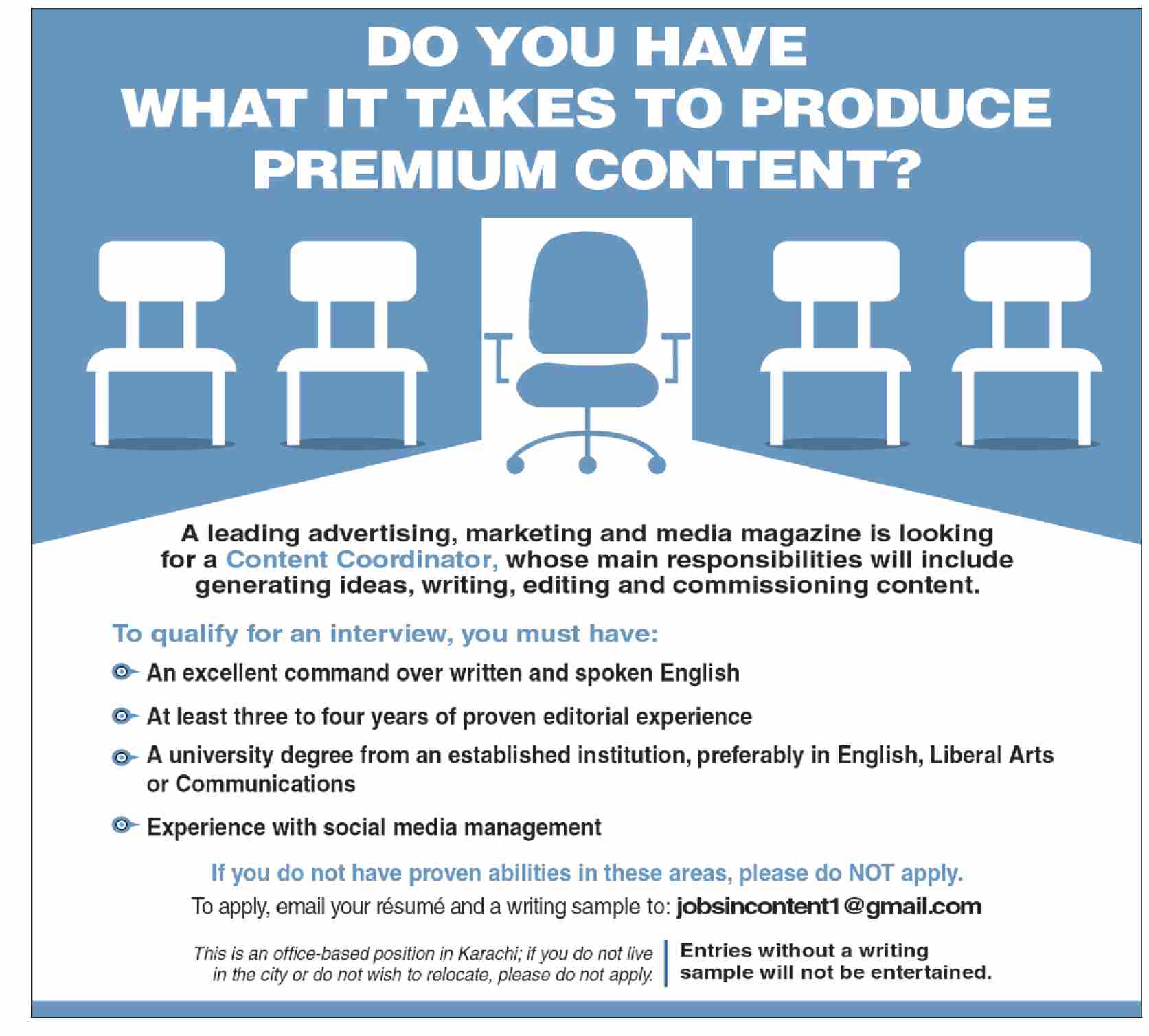 Advertising Agency invites applications for job positions advertised in daily Dawn dated 28 November 2023 for following vacancies in Karachi, karachi Sindh Pakistan.