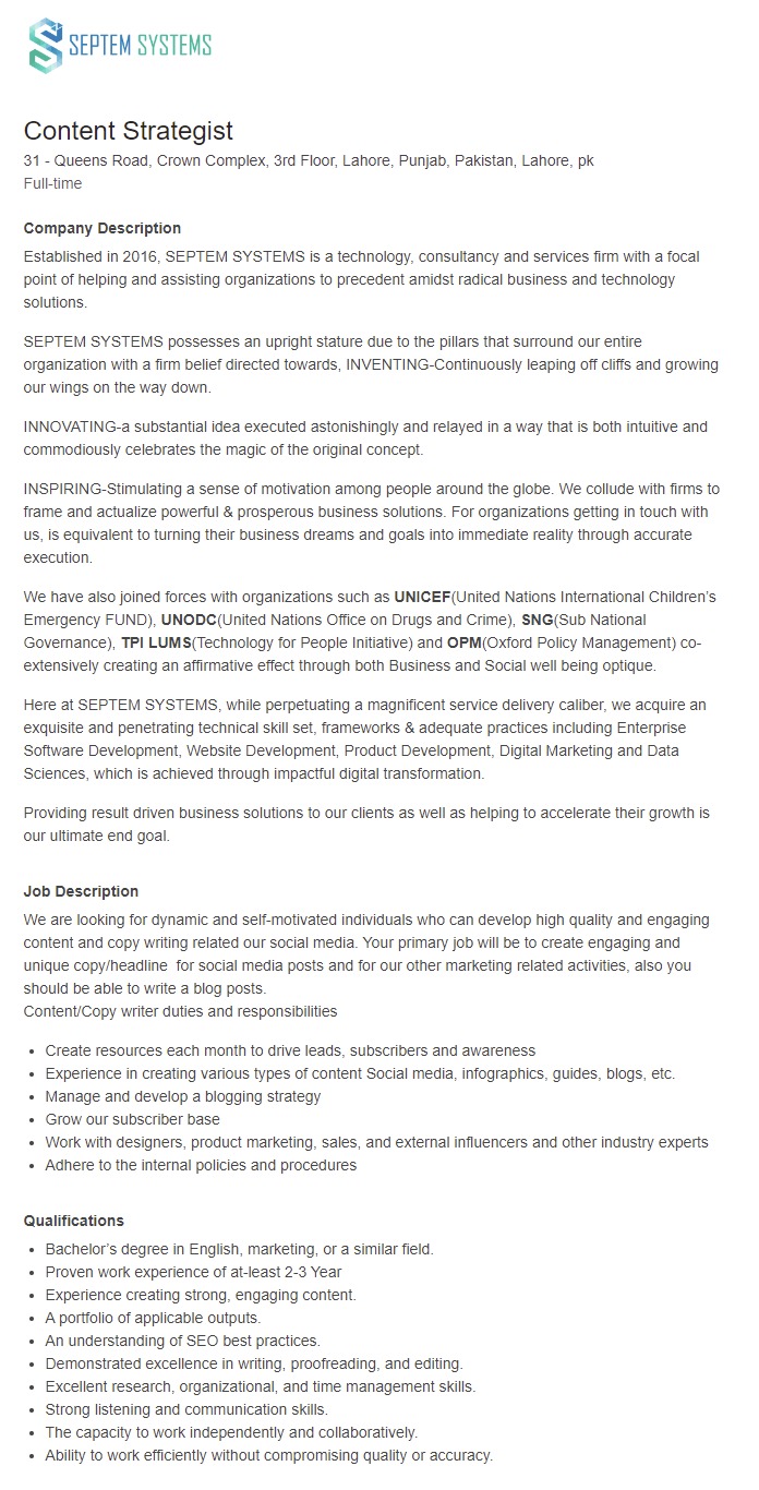Septem Systems Lahore, lahore Punjab Pakistan invites applications from eligible candidates for the post of content strategist as per advertisement of September 30, 2023 published in daily Other Newspaper. Preferred Education is Bachelor and Master etc.