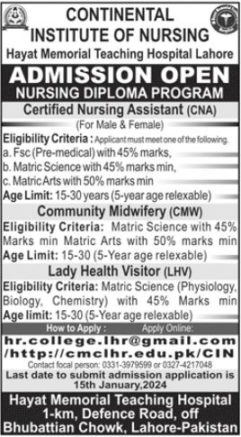 Continental Institute of Nursing Nursing Diploma Program, Certified Nursing Assistant, CNA admissions 2024 has been announced. Continental Institute of Nursing Lahore Punjab Pakistan welcomes students to apply for admissions in academic year 2024 in Medical Medical College. Students who want to enroll for academic session 2024 in Diploma and Course qualification and admission criteria for Government institute can apply till last date 15 January 2024. Read newspaper ad for exact details.