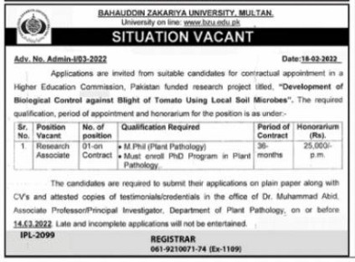 Contract BASE job At. Bahauddin Zakariya University Multan BZU Multan, multan Punjab Pakistan invites applications from eligible candidates for the post of , research associate and as per advertisement of February 25, 2022 published in daily Nawaiwaqt Newspaper. Candidates with Phd and Mphil etc. educational background will be preferred.