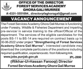 Forest Services Academy jobs advertisement dated about 18 March 2022 in daily Ausaf Newspaper invites application for the vacant post of bps eleven to fourteen in Murree, murree Punjab Pakistan. Bachelor and Master etc. educational qualification will be preferred.