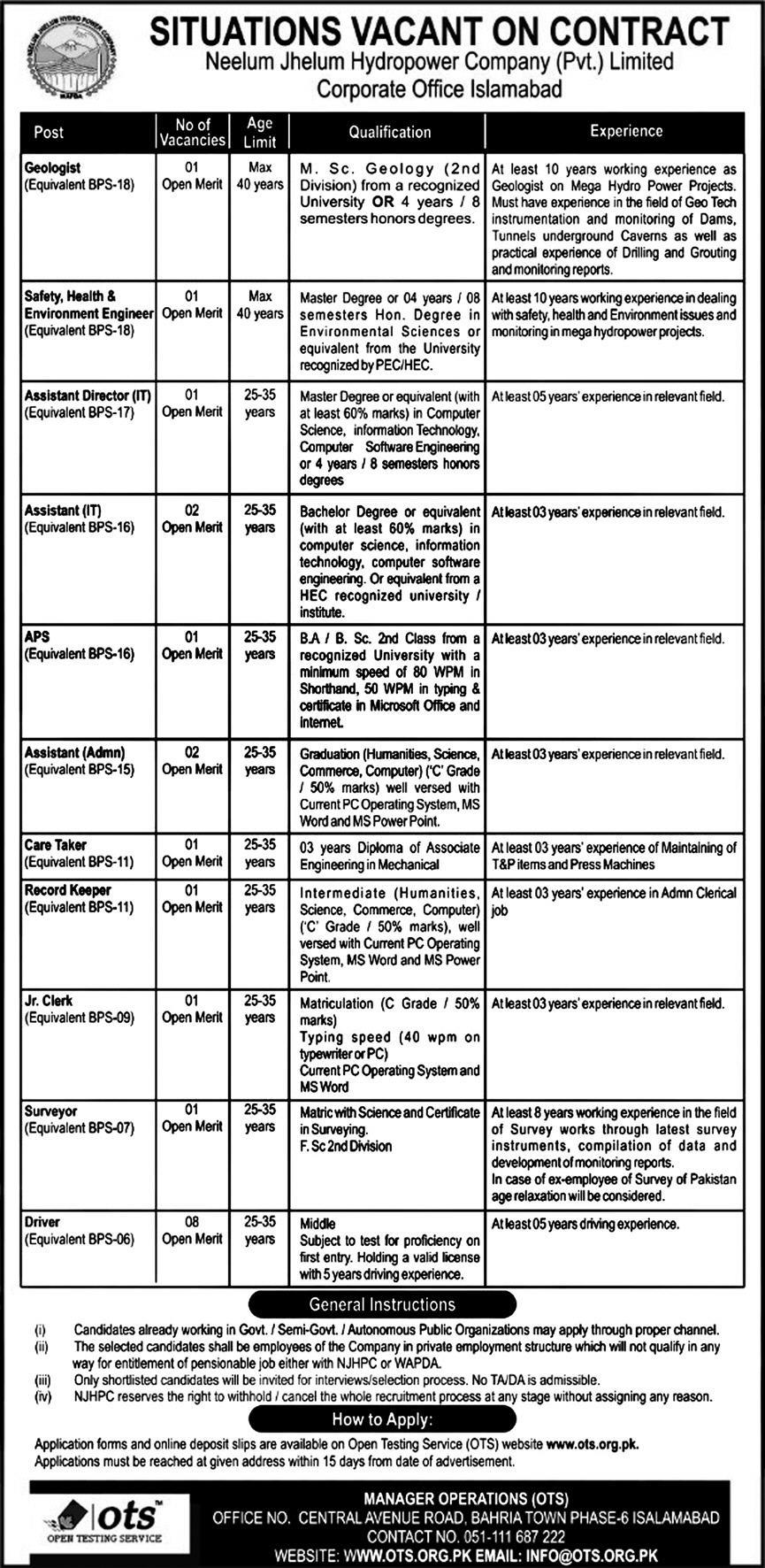 Neelum Jhelum Hydropower Company Islamabad, islamabad Islamabad Pakistan invites applications from eligible candidates for the post of clerk, surveyor, driver, assistant admn, care taker, record keeper, assistant it, assistant director it, aps, safety health environment engineer and geologist as per advertisement of April 10, 2022 published in daily Express Newspaper. Educational qualifications required BCS, M.sc, DAE, MIT, Matric, MCS, Middle, Bachelor, BA, MS and Intermediate etc.